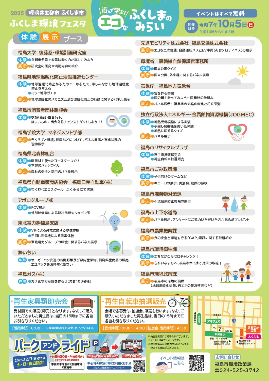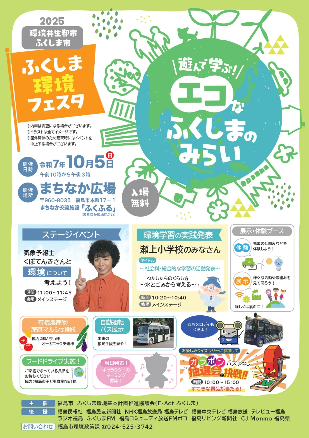 2025年07月28日地球温暖化や再生可能エネルギーなどを分かりやすく学び体験できるイベントです。 ステージイベントや体験コーナー、抽選会など全て無料! 皆さんのご来場をお待ちしています。 イベント名 2025ふくしま環境フェスタ ~遊んで学ぶ!エコなふくしまのみらい~ 日時 令和7年10月5日(日曜日)午前10時から午後3時 会場 まちなか広場(福島市本町17-1) まちなか交流施設ふくふる(福島市本町2-6) 内容 ①瀬上小学校児童による環境学習の実践発表 ②気象予報士くぼてんきによるステージイベント ③自転車による発電実験、間伐材やガス管を使った工作などの体験教室 ④クイズラリーに挑戦してお楽しみガラポン抽選会に挑戦! ⑤自動運転バス、水素燃料電池自動車の屋外展示 ⑥再生家具類の即売会 ⑦再生自転車の抽選販売 など また、当日はイベント専用の、公式LINEを使用しながらお楽しみいただきます。 アカウントの事前登録をしていただくと、当日スムーズに参加することができます。 友達登録:https://line.me/R/ti/p/@377lrmjn