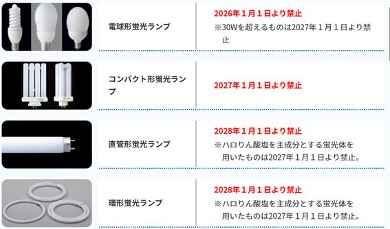 蛍光ランプの種類により製造・輸出入の禁止時期は異なります。 2026年1月以降、種類ごとに段階的に禁止になります。(蛍光ランプは「蛍光灯」や「蛍光管」とも呼ばれます。)